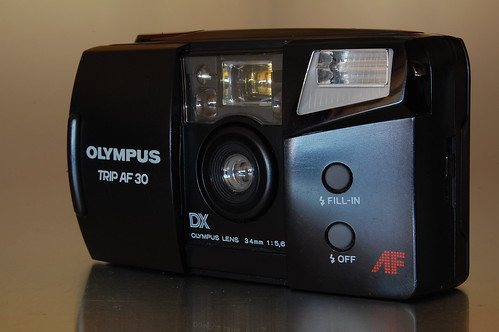 TripAF30は、1996年にオリンパスによって発売されたコンパクトなオートフォーカス35mmカメラです。元々1984年に導入されたTripAFシリーズの一部です。このカメラには、34mmF/5.6のオートフォーカスレンズが搭載されており、レンズを開くと同時に電源スイッチとして機能するバリアで保護されています。カメラボディの前面には、フィルインとフラッシュオフのボタンが付いた内蔵フラッシュがあります。DXコード付きフィルムを使用し、自動で最初のフレームまでモーターで進み、最後のフレームで停止します。電源は2本の単3形電池で供給されます。