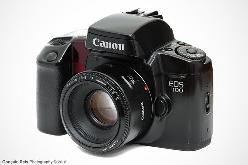 このカメラは、アメリカではEOSElanとしても知られており、焦点ビープオプションの喪失やオートフラッシュのポップアップ機能がないなど、わずかな違いがあります。1991年のプロシューマー市場をターゲットにしたCanonEOS100は、後部に「クイックコントロールダイヤル」を持つ最初の非プロEOSカメラの1つであることが特筆されます。金属ではなくポリカーボネート製のボディを持つ100は、EOSカメラに組み込まれた最初の「ズームフラッシュ」(TTLおよびA-TTL機能対応)も特徴としていました。また、EOS10sから引き継いだ(ややギミック的な)バーコード機能も備えており、特定のバーコードをスキャンしてカメラに画像設定をアップロードすることができます(Canonはこのカメラと一緒に100個のバーコードを含む冊子をリリースしました)。電源には2CR5バッテリーを使用しています。注目すべき特徴:AFアシストランプ、ズームフラッシュ(28、50、80mm)、ファインダー内のカメラシェイク警告、後部のクイックコントロールダイヤル、被写界深度プレビューモード、ミラーロックアップ機能、動作時のノイズ低減技術。