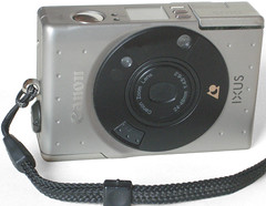 キャノンIXUS(最初のIXUSAPSカメラであり、キャノンELPHやキャノンIXYとしても販売された)は、1996年5月のAPSフィルムシステムの立ち上げにおけるキャノンの有名な小型コンパクトでスタイリッシュな貢献でした。これは、多くのAPSの追加機能を備えた完全な機能を持つカメラでした。IXUSは、現代のコンパクトカメラデザインの画期的な一歩でした。キャノンは、レンズの周りに暗い円を配置し、金属ボディと対照的にすることで、最初のAPSコンパクトに個性的なアクセントを与えました。そのコンセプトから残ったものは、ズームレンズが中央に配置された小さな長方形のカメラボディです。その後、多くのAPSコンパクトカメラやさらに多くのデジタルコンパクトカメラがこのスタイルを取り入れています。IXUSのボディは、ステンレス製の仕上げの金属フレームでしっかりとした作りで、レンズを含むプラスチックディスク内に電源ボタンがあります。手首ストラップには、日付やメッセージの設定用の小さなボタンを操作するためのピンを保持する小さなプラスチックの塊があります。