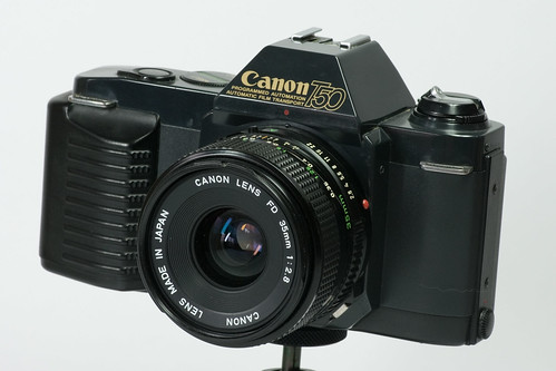 キヤノンT50は、1983年3月にキヤノンによって発表された"Tシリーズ"35mm一眼レフカメラの最初のモデルでした。Tシリーズは、パワード巻き上げとプログラムオート露出を特徴とし、キヤノンFDマウントレンズを使用することができました。垂直走行電子シャッターは、Aモードで2秒から1/1000の速度で動作します。露出計はTTLSPDフォトセルを使用し、範囲は1から18EV(ISO100)です。ISO感度50から1600のフィルムを使用することができます。2本のAA/LR6電池で駆動し、約50本の36枚撮りフィルムを撮影することができます。