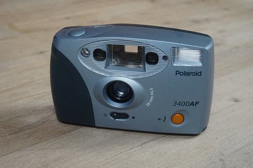 ポラロイド3400AFは、35mmフィルム用のシンプルなカメラです。最大絞りがf/4.5の28mmのオートフォーカスレンズを搭載しています。このカメラは2000年に導入されました。フラッシュはオフにすることができ、フレームカウンターはカメラの上部にある小さな液晶ディスプレイです。スライド式の扉がレンズキャップおよび電源スイッチとして機能します。データバック付きのモデルもありました。動作にはAA電池2本が必要です。