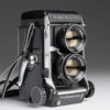 C33は、交換レンズを備えた中判TLRカメラのマミヤCシリーズの一部として1965年に発売されました。これはマミヤC3の改良版です。導入から数か月後、ノブ式の進化版としてマミヤC22がリリースされました。後継機種はマミヤC330です。C3同様、フィルム巻き上げクランクを使用しますが、巻き上げ中にシャッターのコッキングを自動的にサポートします。クランクを時計回りに回すと、自動的に停止します。クランクを反時計回りに回して停止するまで戻す必要があります。ボディの右側には新しい専用のレンズ距離スケール窓があります。65mmと80mmの焦点距離に対応したスケールが表示されます。左側のベローズプレートには、105mm(クローム)、135mm、180mmレンズの距離スケールがあります。一部のモデルには55mmと250mmレンズ用の追加スケールもあります。レンズの視差選択ノブはボディの左側にあります。