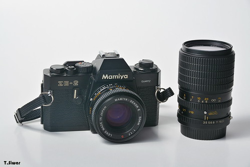 1980年12月に発売されたマミヤZE-2は、ZEで始まった石英制御の金属焦点平面シャッターを継続しました。両方のカメラは絞り優先の自動露出を備えており、一度決定されたら、両方の絞り設定をロックすることができます。ZE-2には振動防止警告とシャッタースピードダイヤルが追加され、手動オーバーライドが可能になりました(ZEではシャッタースピードを手動で選択できません)。電子センサーが各レンズをカメラに6つの金の接点を介して結合しました。センサーは、その焦点距離に最適な手持ちシャッタースピードを自動的に選択しました。