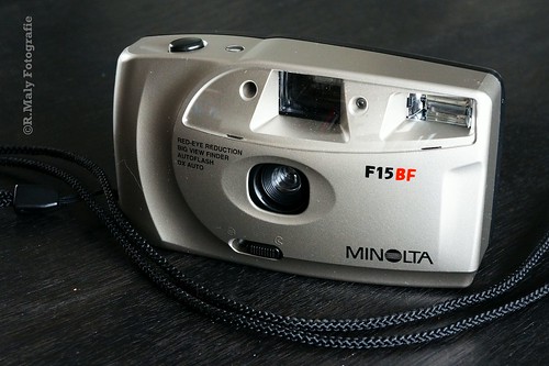 ミノルタF15BF。シンプルなプラスチック製の固定焦点カメラで、名前にBFが付いているのは、かなり大きなファインダーを備えているからです。このカメラには、赤目軽減機能付きの自動フラッシュ、適切な露出を確認するための背面の緑色LED、自動DXコーディング、モーター式のフィルム送りおよび巻き戻しが搭載されています。スライド式のレンズキャップが電源を切り替え、レンズを保護し、2本の手軽に入手可能な単3形乾電池で作動します。これは典型的なポイント&シュートカメラです。