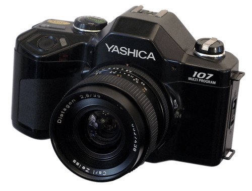 Yashica107MPは、Yashica107MultiProgram、YashicaTR7000MP、または単にYashica107としても知られる、京セラ製の35mm一眼レフカメラです。107ボディはDentalEyeIIにも使用されました。Daewoo107MultiProgramとマークされたバージョンや、Foto-QuelleのRevueAC7も利用可能でした。Contax/YashicaマウントまたはC/Yマウントを使用しています。プログラムモードは5つあります。プログラムオート、HP:高速プログラムオート、LP:低速プログラム、マニュアル露出、X:マニュアルフラッシュ露出です。シャッターリリースは電子式ですが、フィルム巻き戻しノブの横に標準のリリースソケットも備えています。ロール内の露光がすべて終了すると、カメラは停止します。巻き戻しを行うには、ベースにあるボタンを押し、フィルム巻き戻しノブを使用します。フォーカスは手動で行われ、水平分割イメージスポットとマイクロプリズムが補助されています。ビューファインダーは0.82倍の倍率をし、ほぼ92%の視野をします。ファインダー内では、