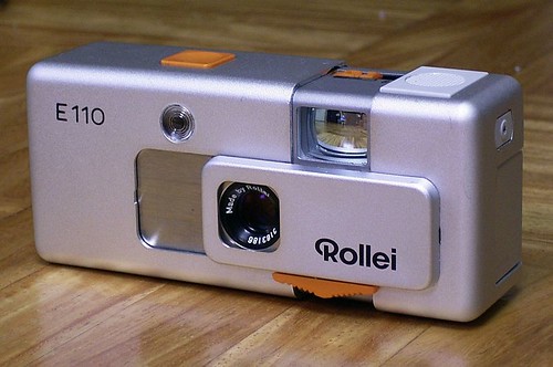RolleiE110はRolleiA110の「予算版」です。両者の主な違いは、単純化された露出システムです。E110はCdSフォトセルを使用しており、一方A110はシリコンフォトセルを搭載しています。E110では、カメラを開いたときにアクセスできるオレンジ色のスライドでレンズの絞りをf/2.8、5.6、または16に設定します。その後、カメラの露出システムがシャッタースピードを設定します。A110では、カメラが絞りとシャッターの両方を設定します。したがって、Rolleiの110カメラの安価なバージョンは実際には写真家により多くの柔軟性をします。ビューファインダーは、倍率が0.6倍の明るいフレーム式アイレベルユニットで、距離(組み合わせメートル/フィート記号スケール)、通常/長時間露出(速度が1/30秒以上の場合の緑色LED、より長い速度の場合はLEDなし)、シャッターリリース、およびバッテリーのインジケータを備えています。